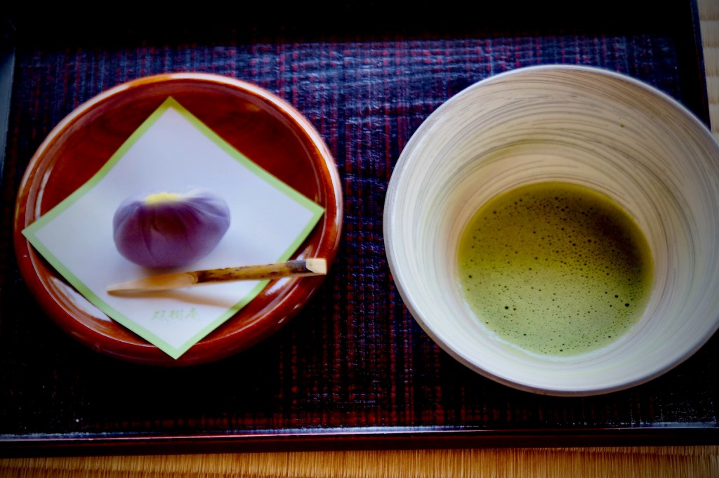 This was my very first cup of matcha green tea. I tried it at a traditional tea house in Arashiyama near Kyoto  – with a traditional Japanese sweet to accompany it.