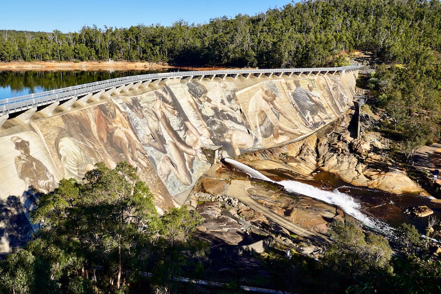 It’s not a hard sell. Collie – once known as Western Australia’s dirty coal town – is morphing into a very attractive place with a lot of attractions for visitors, including national parks, attractive waterways forests. And it has the Wellington Dam, now a canvas for one of Australia’s most famous new mega murals.