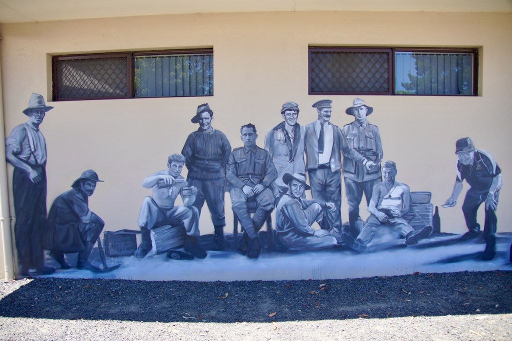 The mural was painted by Australian Guido Van Helten. Apparently, because our WA borders were tightly controlled for Covid, he had to isolate in a local hotel for a fortnight after flying in from the United States to start the project. He sorted through local photographs, stories and memorabilia before choosing six images of real people to reflect the local community on the dam wall. They include migrant workers, kids playing sand, and an 1800’s aboriginal couple.