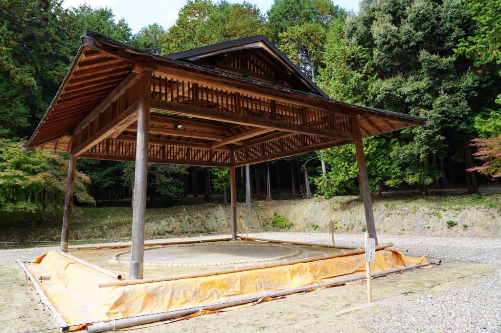 While Yoshimine-dera had a deep feeling of reverence about it, Ōharano Shrine felt lighter, more joyful. Was it the vermillion red colour adorning its buildings – my favourite colour – or the fact that one of the first things we saw as we approached was a Sumo dohyō  – the ring where sumo wrestlers fight. I am a die heart sumo fan, so this caught my interest immediately. Sumo at a shrine?