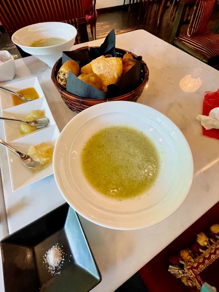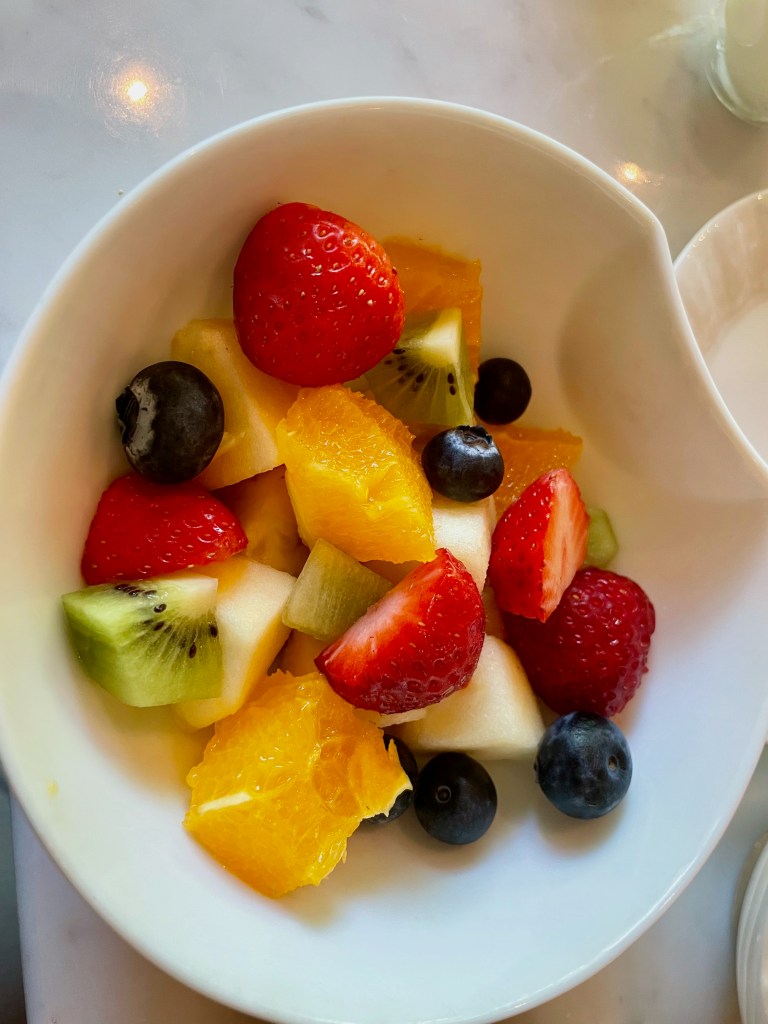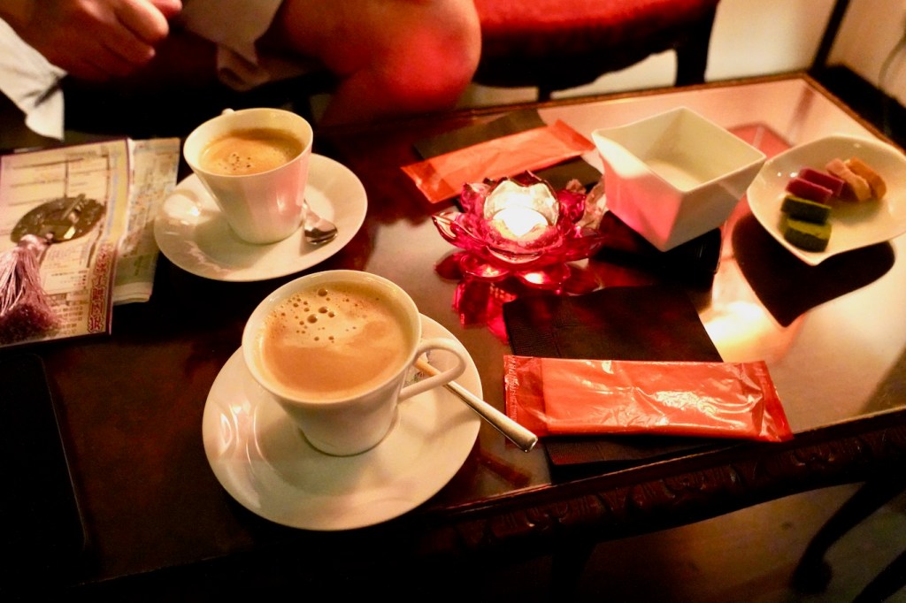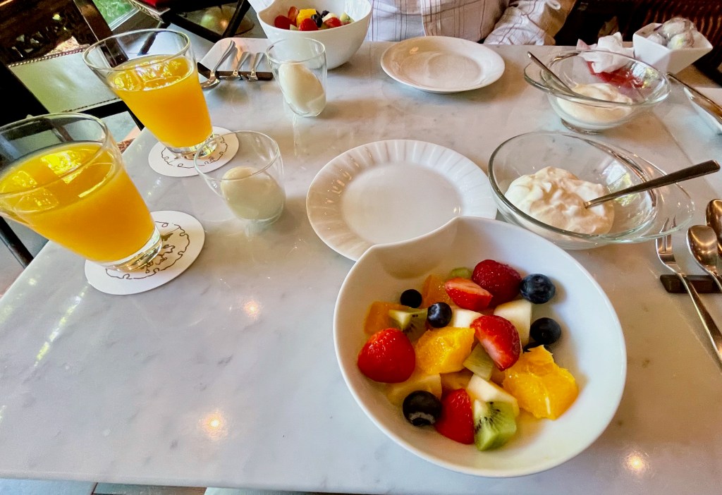 Rather than taking our luggage and ushering us back out the red door – remember, we were three and a half hours early – they offered us complimentary refreshments in the hotel’s beautiful little lounge/dining area, sitting by a window overlooking the river. A latte for me, tea for him, and exquisite little biscuits.