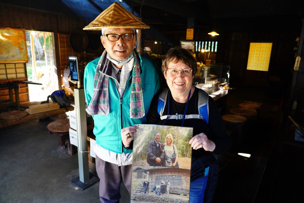 Hiking part of the old Nakasendo trail in the Kiso Valley, she stopped at a remote tea house, formerly a farm house, that welcomes walkers with a place to rest and enjoy free green tea. Today, her photo taken with her tea house hosts holds pride of place on the old wooden tea house walls.