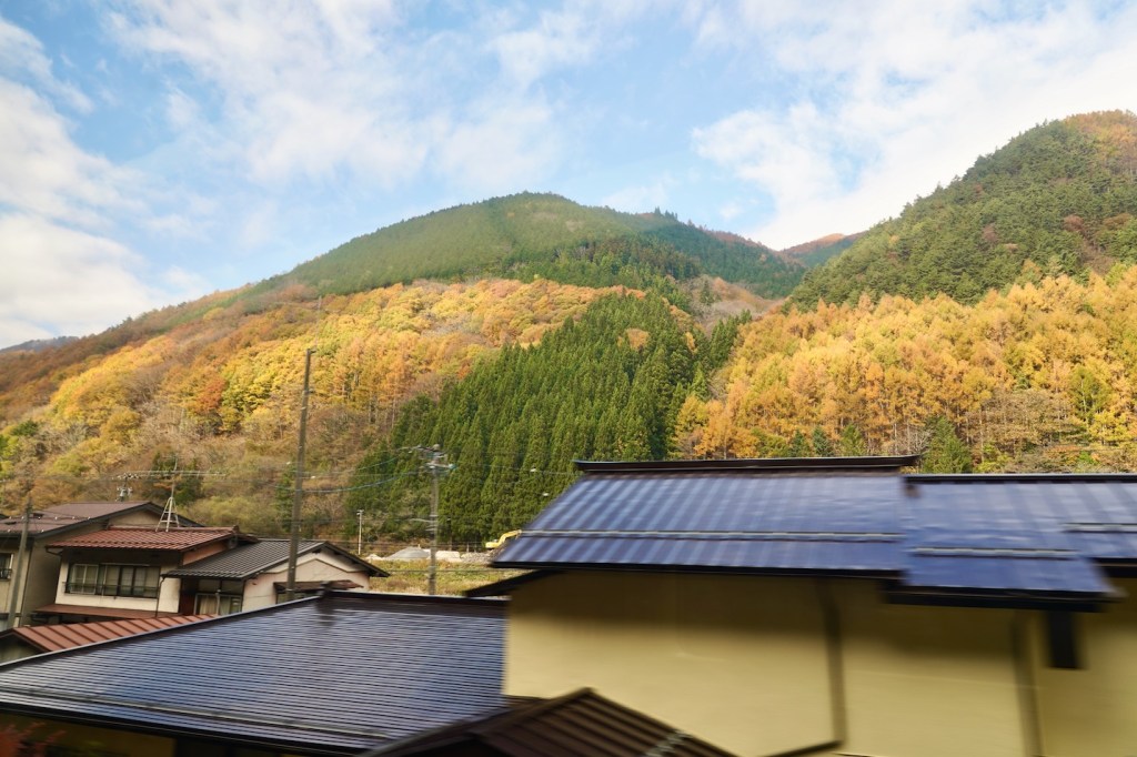 The beauty of this ancient town is that it is also easily reached by a very comfortable train from Matsumoto that winds its way along the Kiso Valley route – and if you go in November, as we did, you will find the journey simply stunning with autumn colours ablaze in the hills along the way.