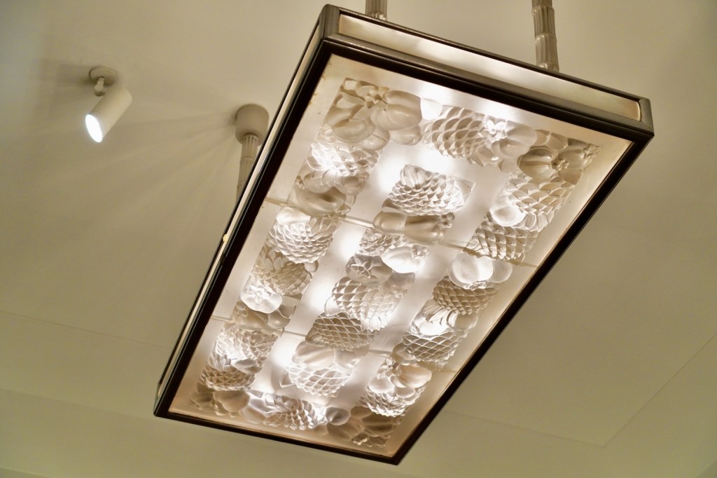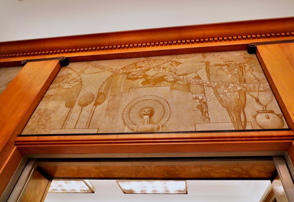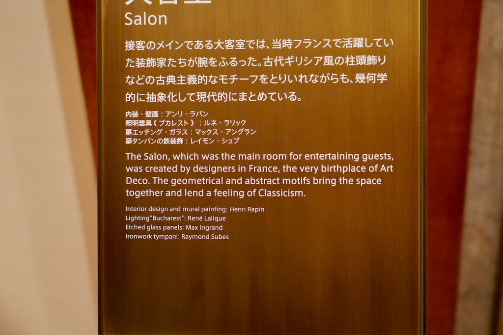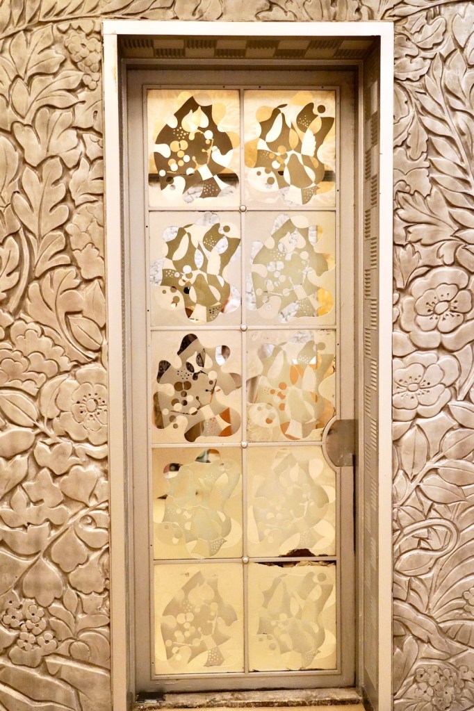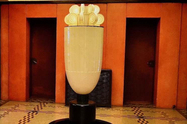 The main entrance provides a hint of what’s to come with glass-relief doors by the French glass artist René Lalique. It was a new design created especially for the Prince Asaka Residence and executed in pressed glass, each door features a standing female figure surrounded by a backdrop of open wings.