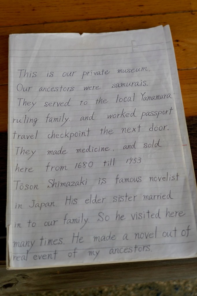 A few doors along from the checkpoint we noticed a private museum in what appeared to be a fairly unattractive concrete building. We weren’t quite sure what it was about, but we decided to go into the front courtyard. Across on the other side of the courtyard, we could see a typical Japanese wooden home. Mystery packages are sometimes the best! What we had walked into was the original Samurai home of a leading Samurai family in Kiso Fukushima – and Kaoru Kumagai, the woman who came out into the front courtyard to greet us, is a direct descendant. These are the wonderful personal encounters that I treasure the most in Japan.