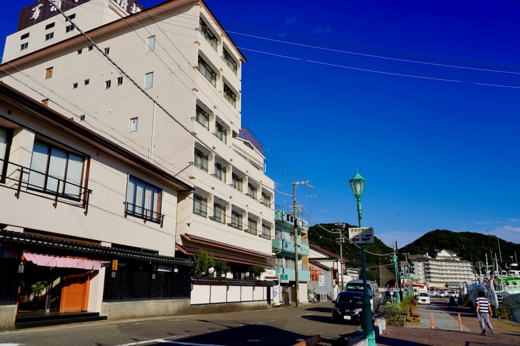 It doesn’t have a lot of hotels. Probably the most modern is the resort Kumano-bettei Nakanoshima, built on its own private island in the bay, away from the main town. You have to board a 5 minute ferry ride to reach it from Katsuura’s wharves. Apparently, it has six outdoor hot spring baths located around the island. I’m not an Onsen fan, so this held no attraction for me. Plus, we wanted to be a short walk from the railway station. We booked a small old local hotel, well situated right on the foreshore. It had the feel of a ryokan, with guests required to change into house shoes at the front entrance. Both western style and japanese ensuite rooms were offered, with a traditional Japanese breakfast and dinner included.
