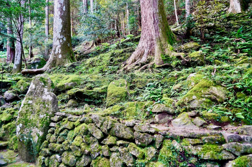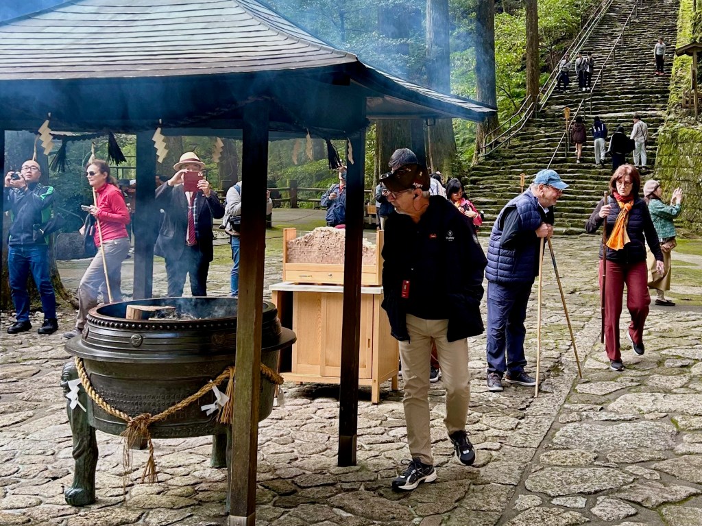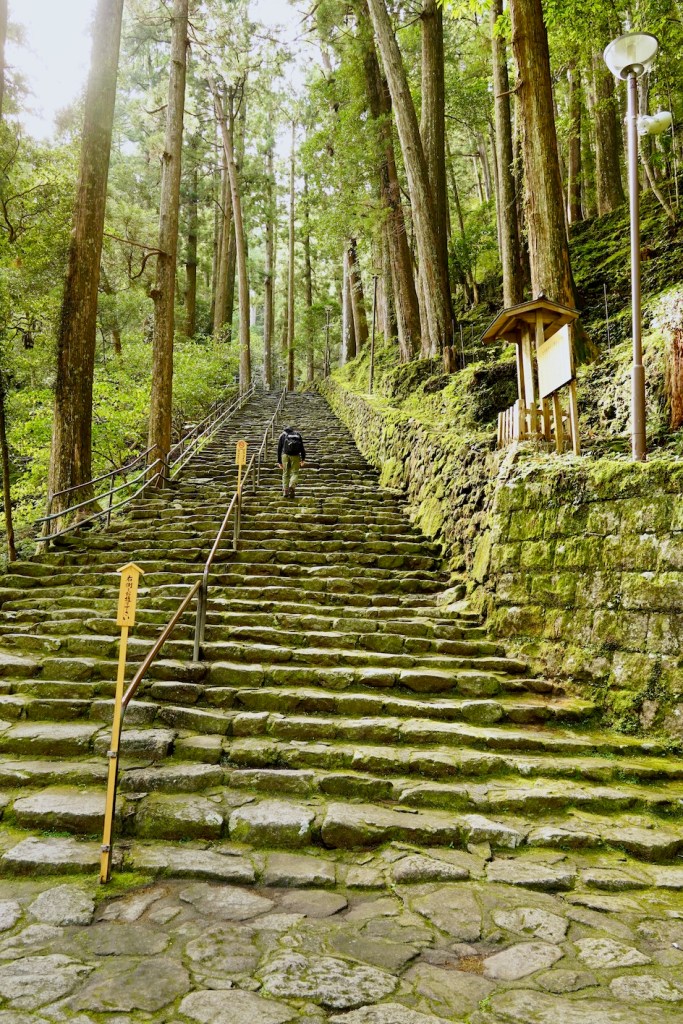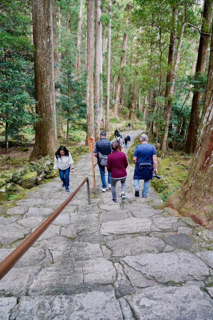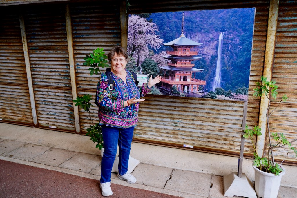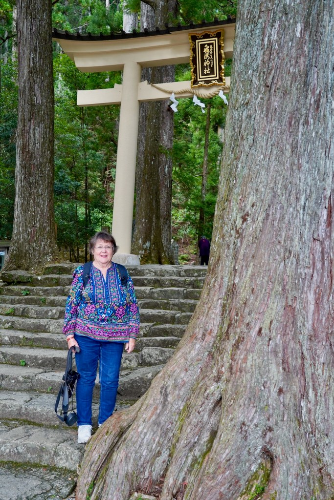 At the stop before the main Falls bus stop, most of the passengers got off to walk along a tiny part of the famous Kumano Kodo trail to the Falls. It is an ancient pilgrimage trail that is actually a network of trails with the main route covering about 70 kilometres. It can take four to five days and is not for the faint hearted! A small hub of shops were at our bus stop, and ahead of me was a formidable bank of wide stone steps heading upwards to the top of an hill, over the top and descending to the base of the Falls. Going in 467 steps – more than 900 return! For normally fleet footed beings with healthy knees, this would only take about 5 minutes. But it was a lot more challenging for me. I thought at the time I was dealing with a failed total knee replacement, undertaken a few years back. I’ve since found out that the patella on the new knee was in a shocking state, cartilage crumbling away. Slowly goes the tortoise – but I made it.