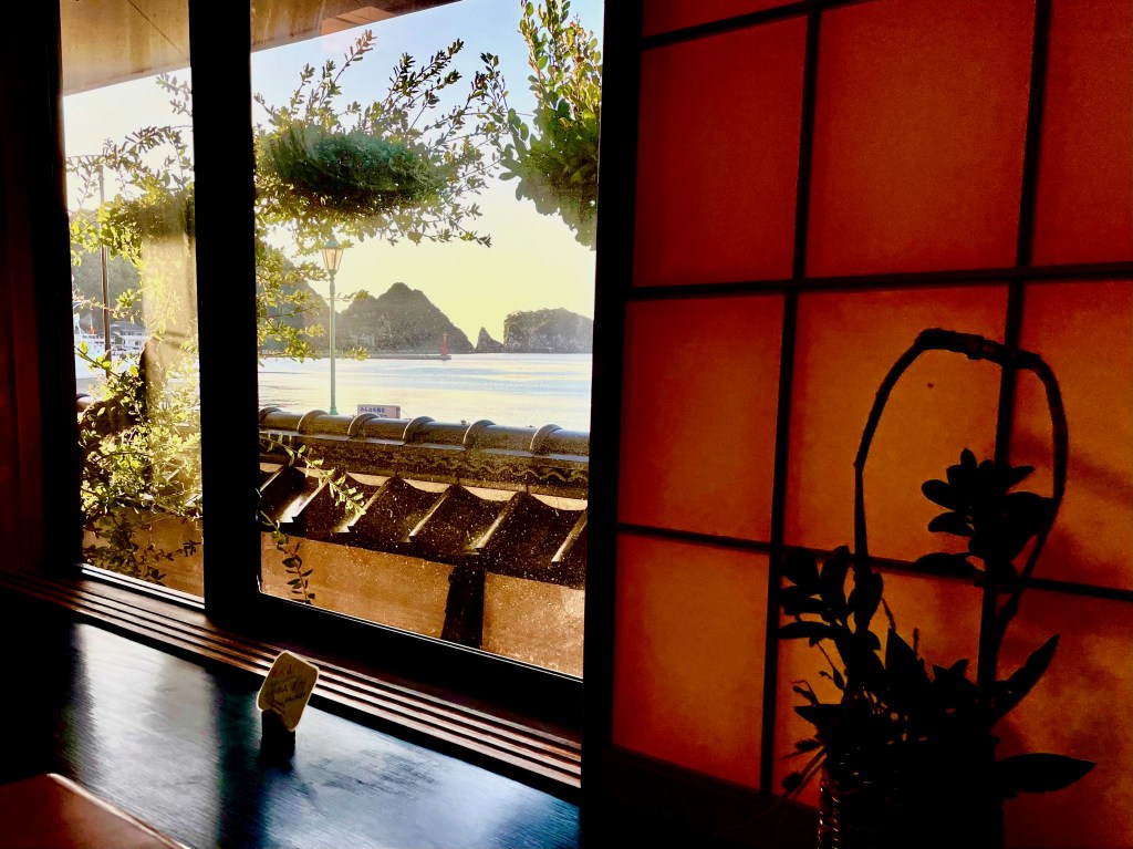 We travelled to Kii-Katsuura on a Saturday from Nagoya on the JR Limited Express Nanki, with wide view windows perfect for enjoying the beautiful scenery en route. The town was surprisingly quiet as we wandered down the main Street to deposit our luggage at our hotel. We took note of a cafe advertising a menu in English, returning there for lunch. ‘Ama ai’ offered both first class coffee and delicious food, including excellent cakes for desert. What more can you ask for! A chilled beer? Of course!